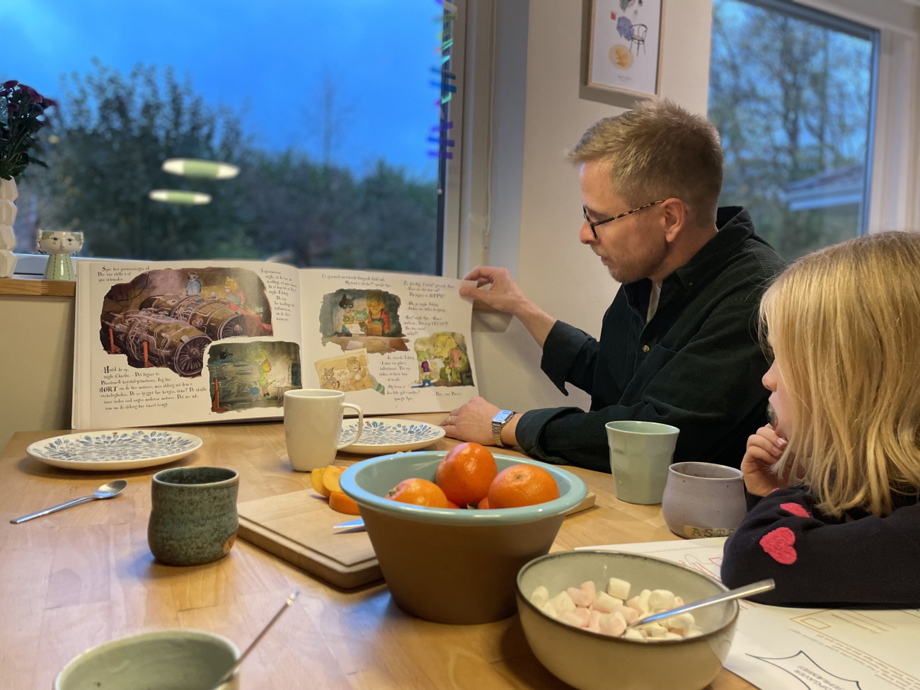 Der lægges op til, at læsningen kan gå på skift i familien, så barnet både øver sig i at læse og at lytte.